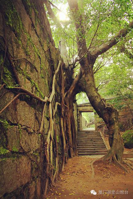 【阿胡】哇塞!真的超神奇耶!我不禁想要赞叹榕树记忆深藏在密密的年轮里,依旧餐风饮露,笑傲风雪烈日;我欣赏榕树深植土地的风骨、遮阳挡雨的胸襟,不仅给了闽南人庸常生活的心悦感受,也为来自四面八方朋友增添了养眼迷人的独特色彩!对了炮台君,我还发现在炮台“树根包墙”的景象随处可见,有一种说不出的神秘美!特别是后门出入口处的榕树根像瀑布一样倾泻在墙体上,留下一条条“水痕”。
